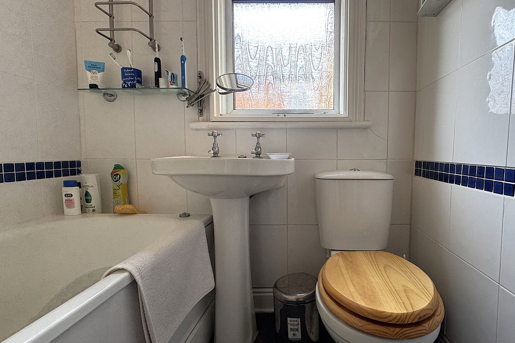 BATHROOM 5' 5" x 5' 10" (1.66m x 1.80m) The bathroom comprises a panelled bath with shower riser over and a glazed shower screen, a pedestal wash hand basin, a low‑flush WC, and a heated towel rail. An obscure‑glazed window provides natural light while maintaining privacy, and the space is finished with tiled walls and flooring for easy maintenance.