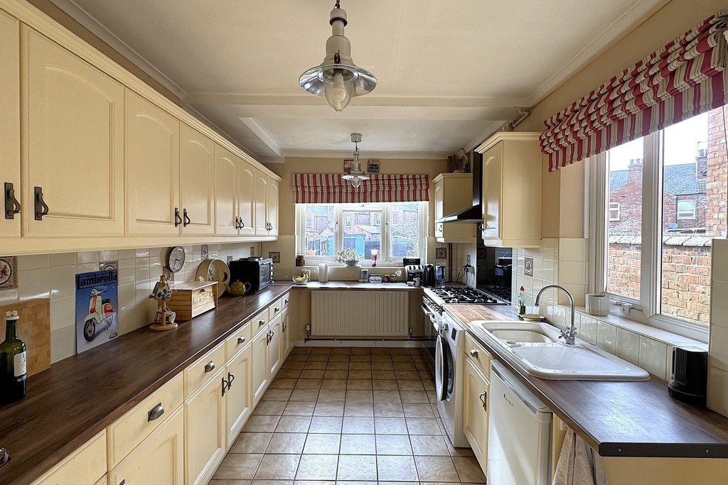 KITCHEN 15' 10" x 9' 9" (4.85m x 2.98m) The kitchen is fitted with a generous range of wall, base and drawer units topped with work surfaces, along with a practical breakfast bar. A ceramic one‑and‑a‑half bowl sink and drainer, space and plumbing for a washing machine. A range cooker with extractor hood provides a strong focal point. Dual aspect windows and an external door to the side, a radiator, and tiled flooring for easy maintenance.