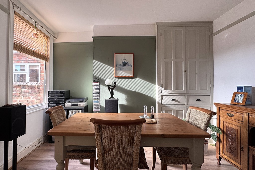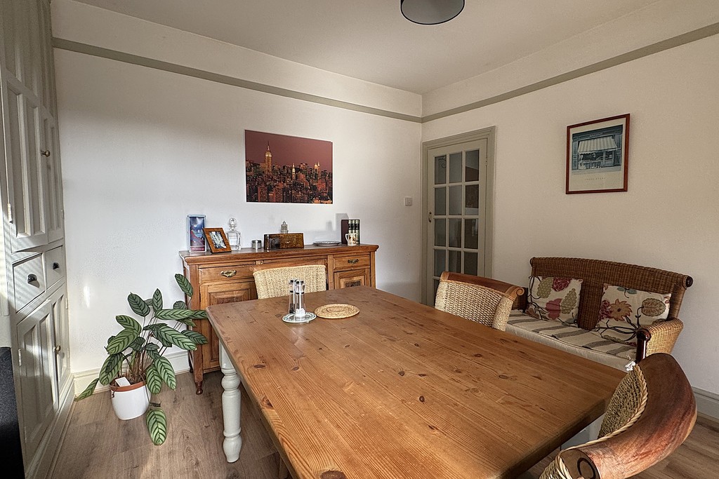 DINING ROOM 11' 7" x 12' 1" (3.54m x 3.69m) Enjoying a window to the rear aspect, this versatile reception space includes an under‑stairs storage cupboard, and additional built‑in cupboards with drawers for practical everyday organisation. A picture rail adds a touch of period charm, while the laminate wood flooring leads through to the kitchen via an internal door.