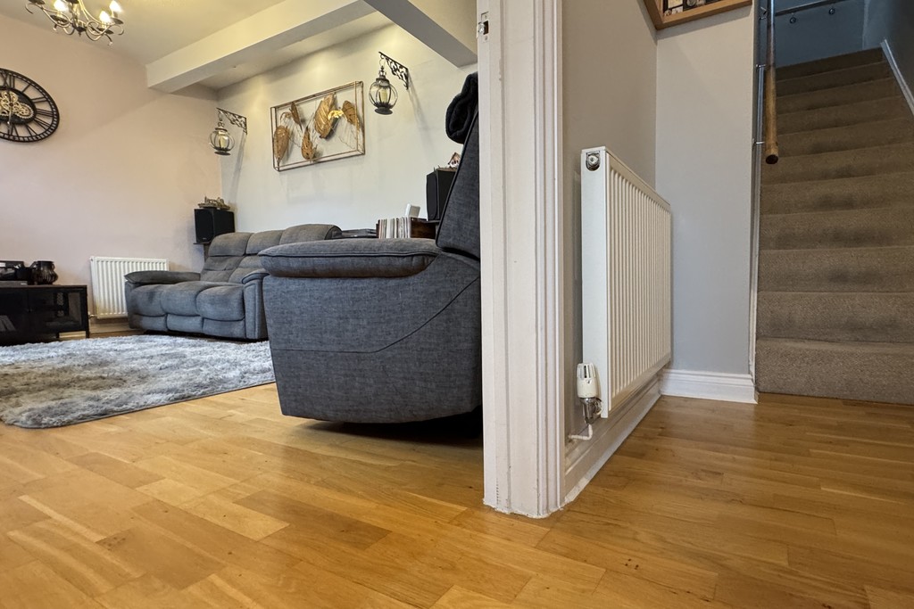 LOUNGE 17' 7" x 10' 11" (5.38m x 3.35m) Featuring three front-facing windows allowing plenty of natural light, three radiators, a wall-mounted electric fire, storage cupboard and laminate wood flooring.
