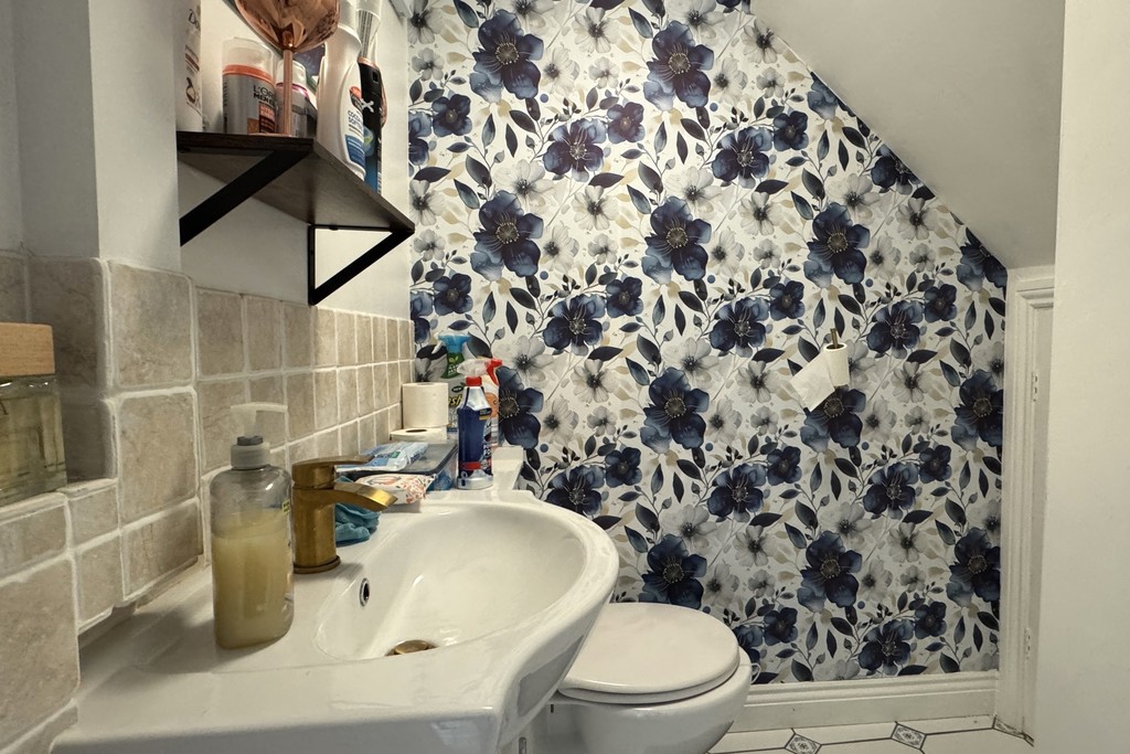 CLOAKROOM Comprising of a low flush WC, vanity unit wash hand basin, tiled splash backs and flooring, under stair storage cupboard and extractor fan.