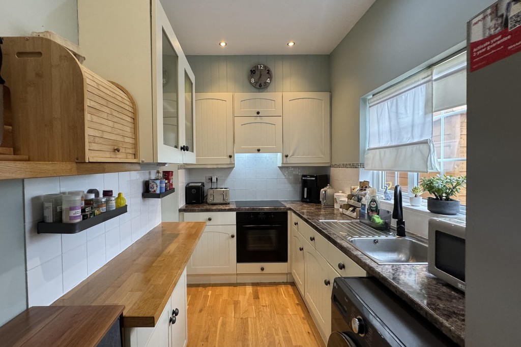 KITCHEN 11' 7" x 6' 2" (3.55m x 1.9m) Equipped with a variety of wall, base, and drawer units topped with work surfaces, tiled splashbacks, and a stainless steel sink and drainer with a mixer tap. There's space and plumbing for a washing machine, along with integrated appliances like a dishwasher, an electric fan oven, and a BOSCH induction hob with an extractor above. A window offers a view of the rear garden, complemented by a radiator and laminate wood flooring.