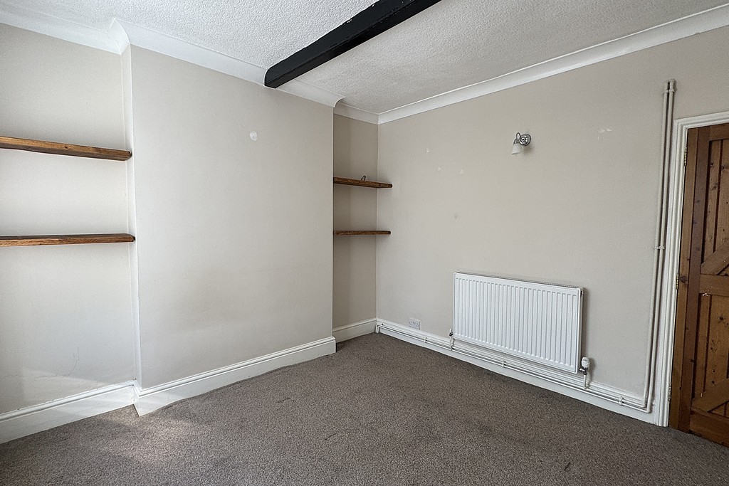 BEDROOM ONE 10' 11" x 10' 5" (3.34m x 3.2m) Having a front facing window with a fitted blind, radiator, wall lights, exposed ceiling beam, fitted shelving and carpet flooring.