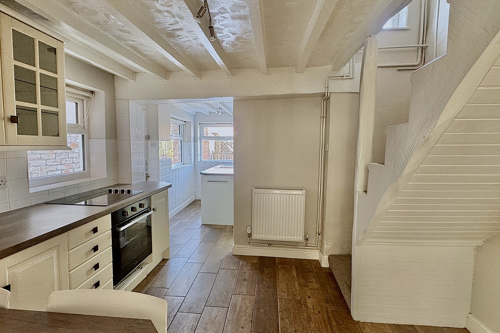 KITCHEN/DINER 9' 11" x 10' 10" (3.03m x 3.32m) Fitted with a range of wall, base and drawer units topped with work surfaces, breakfast bar, integrated electric oven and hob. Exposed ceiling beams add character, window to the side aspect with fitted roller blind, two radiators, stairs rising to the first floor, LED lighting and wood effect tiled flooring continuing through to the utility area.