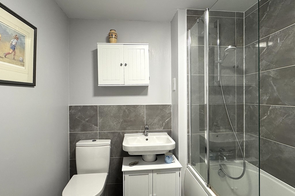 BATHROOM 6' 5" x 6' 10" (1.98m x 2.09m) Comprising of a panel bath with shower over, complemented with a glazed shower screen, pedestal wash hand basin, close coupled WC and a heated towel rail. Part tiled walls, electric shaver socket, extractor fan and cushion vinyl flooring.