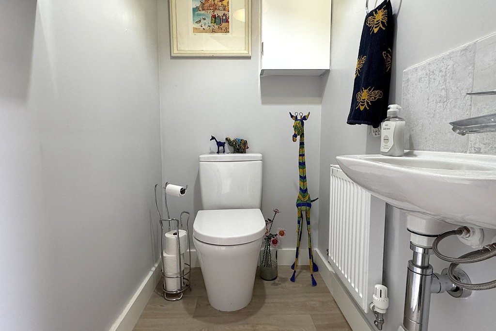 CLOAKROOM 3' 5" x 4' 9" (1.05m x 1.46m) Comprising of a low flush WC and a wall mounted wash hand basin. Radiator, extractor fan, two cupboards and cushion vinyl flooring.
